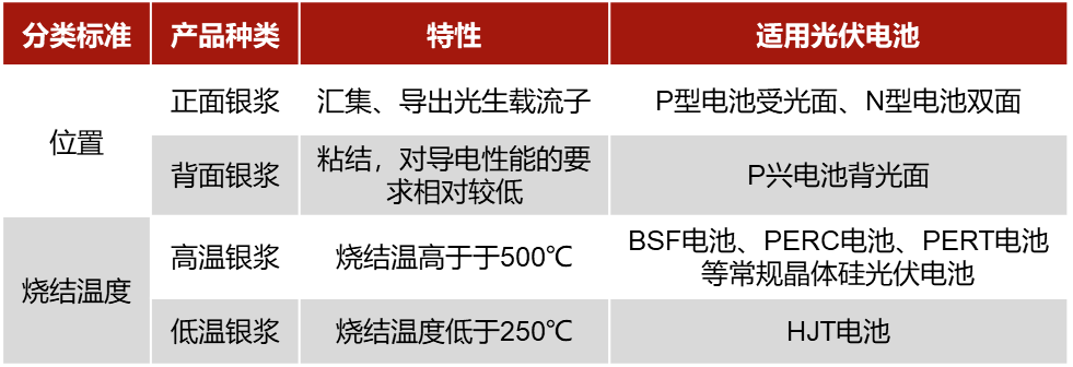 按技术路线及工艺流程分类,光伏银浆可分为高温银浆及低温银浆。目前P型电池及N型TOPCon电池主要使用高温银浆,而HJT电池则由于非晶硅薄膜含氢量较高等特有属性,要求生产环节温度不得超过250℃,因此,HJT电池的发展与低温银浆的技术、生产成本等因素息息相关。