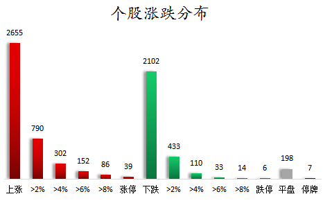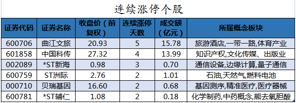 截至收盘,沪深两市合计2655只个股上涨,2102只个股下跌,平盘个股198只,停牌的个股7只。不含当日上市新股,共有39只个股涨停,6只个股跌停。连续涨停天数看,曲江文旅已连收5个涨停板,连续涨停板数量最多。