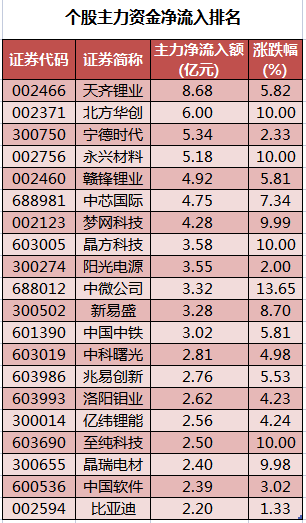 个股来看,今日有2045只个股获主力资金净流入,其中,60股获主力资金净流入超1亿元。天齐锂业获主力资金净流入最多,净流入金额为8.68亿元;主力资金净流入居前的个股还有北方华创、宁德时代、永兴材料、赣锋锂业、中芯国际,净流入金额分别为6亿元、5.34亿元、5.18亿元、4.92亿元、4.75亿元。