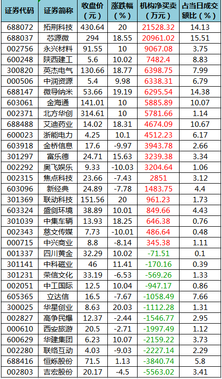 盘后龙虎榜数据显示,今日机构席位资金合计净买入约9.57亿元。其中,净买入的个股21只,净卖出的个股12只。机构净买入最多的股票是拓荆科技,净买入金额约2.15亿元;机构净买入居前的还有芯源微、永兴材料、陕西建工、英杰电气、中润资源等股。机构净卖出最多的股票是吉宏股份,净卖出金额约5563.02万元;机构净卖出居前的还有恒烁股份、联络互动等股。