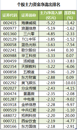 此外,2906只个股被主力资金净卖出,其中,64股被主力资金净卖出超1亿元。主力资金净流出最多的个股是海康威视,净流出金额为5.22亿元;主力资金净流出居前的个股还有浪潮信息、三六零、TCL中环、蓝色光标、歌尔股份,净流出金额分别为5.19亿元、4.85亿元、3.85亿元、3.63亿元、3.44亿元。