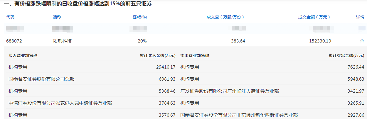 拓荆科技今天涨停。盘后数据显示,6个机构出现在龙虎榜单上,合计净买入约2.15亿元;国泰君安证券股份有限公司总部买入6081.93万元;广发证券股份有限公司广州临江大道证券营业部卖出3421.97万元。