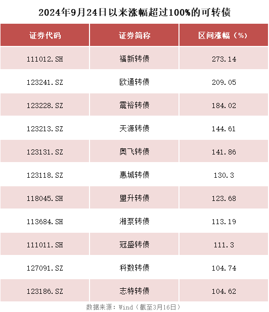 在中证转债指数累计上涨超20%的背景下,转债市场“牛券”横出。据证券时报记者梳理,自2024年9月以来,截至3月16日,有246只转债的区间累计涨幅超20%,占比近50%。其中,福新转债、欧通转债区间累计涨幅超200%,震裕转债、盟升转债、科数转债等多只转债走出翻倍行情。