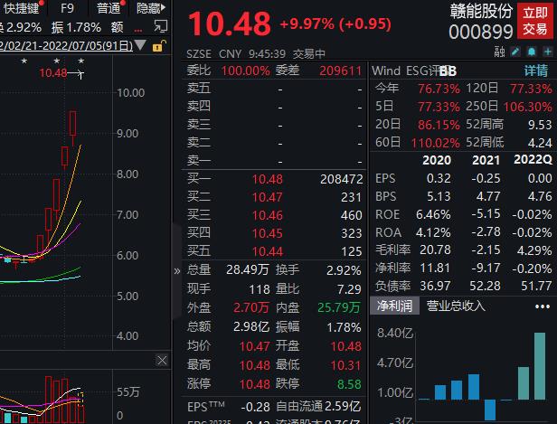 7月5日,赣能股份一字涨停,录得六连板,报10.48元,最新市值102.25亿元。