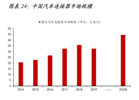 我国汽车连接器市场增速趋势与全球市场趋同,总体呈上升趋势。根据Bishop&Associates推测,2025年我国汽车连接器市场规模将达到44.68亿美元。