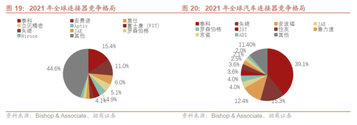 招商证券刘文平等在4月18日研报中表示,全球前10大连接器供应商的市场份额已从38.0%上升至2021年的55%,欧美、日本的连接器跨国企业仍具有较大优势,凭借更充足的研发资金以及多年技术沉淀,在高性能专业型连接器产品方面引领了行业的发展。如泰科、安费诺、莫仕等全球性龙头企业。