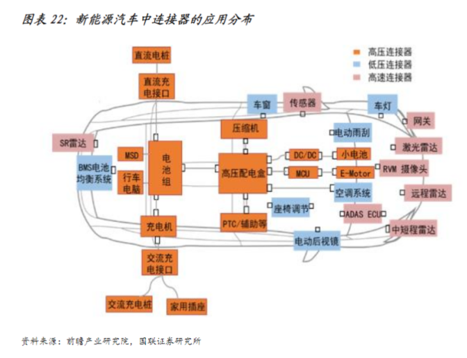 作为电子电路的沟通桥梁,连接器是构成整个电子装备必备的基础电子元器件。国联证券孙树明7月16日研报中指出,连接器是新能源汽车中不可缺少的部件,相较于传统汽车单车连接器数量约为500个,价值约2000元;而新能源汽车单车连接器数量在800至1000个,价值约5000元,远高于传统汽车的平均水平,这意味着新能源汽车对连接器产品需求量及质量要求都将大幅提升。