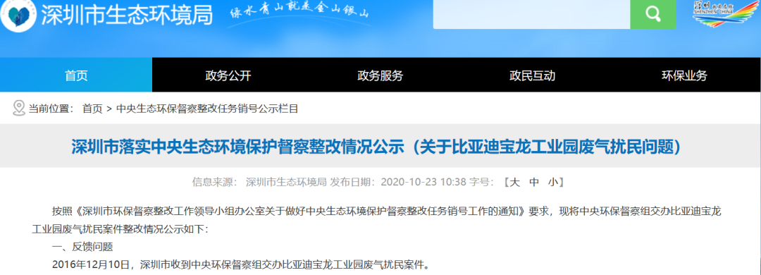 此前,比亚迪已有陷入环保问题案例。2020年10月23日,深圳市生态环境局官网发布《深圳市落实中央生态环境保护督察整改情况公示(关于比亚迪宝龙工业园废气扰民问题)》(下称“《整改情况公示》”)。