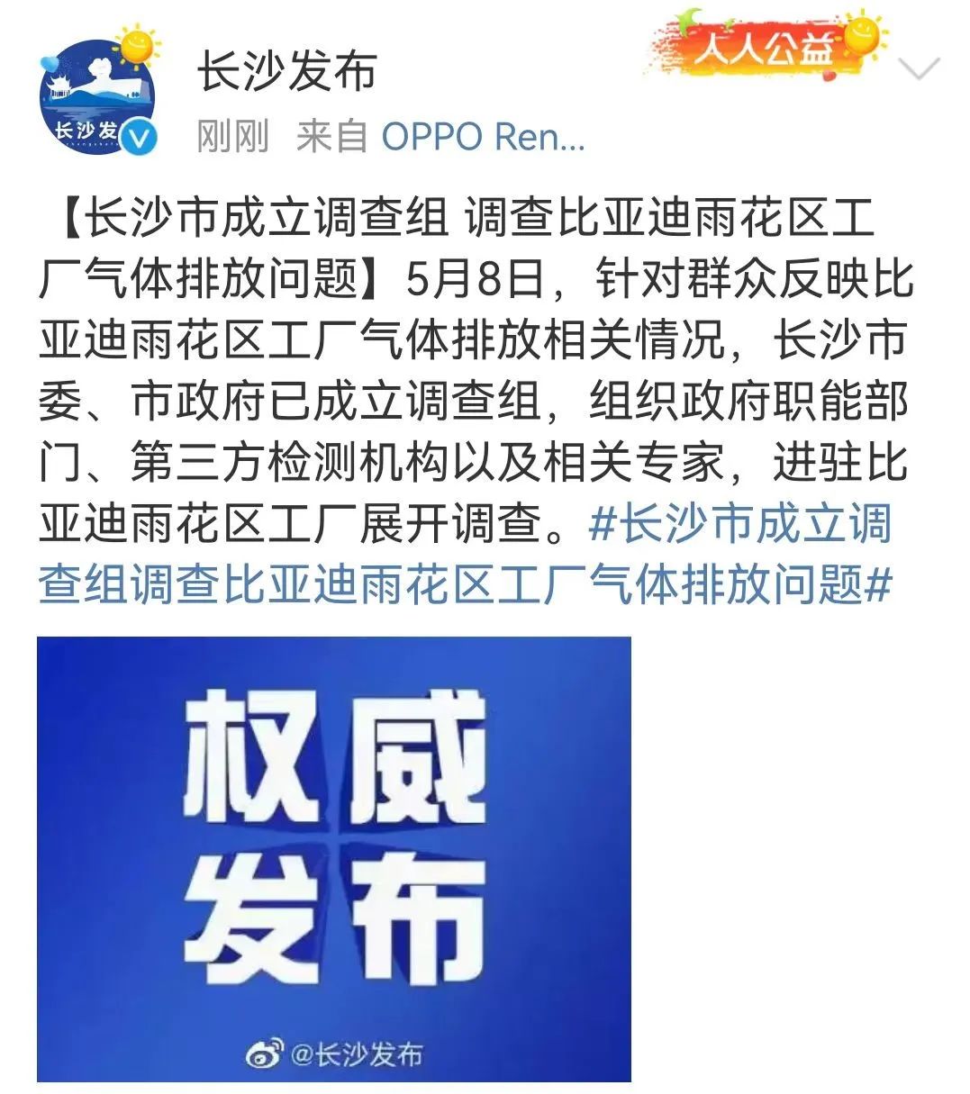 5月8日下午,长沙市委网信办官方微博“长沙发布”消息显示,针对群众反映比亚迪雨花区工厂气体排放相关情况,长沙市委、市政府已成立调查组,组织政府职能部门、第三方检测机构以及相关专家,进驻比亚迪雨花区工厂展开调查。