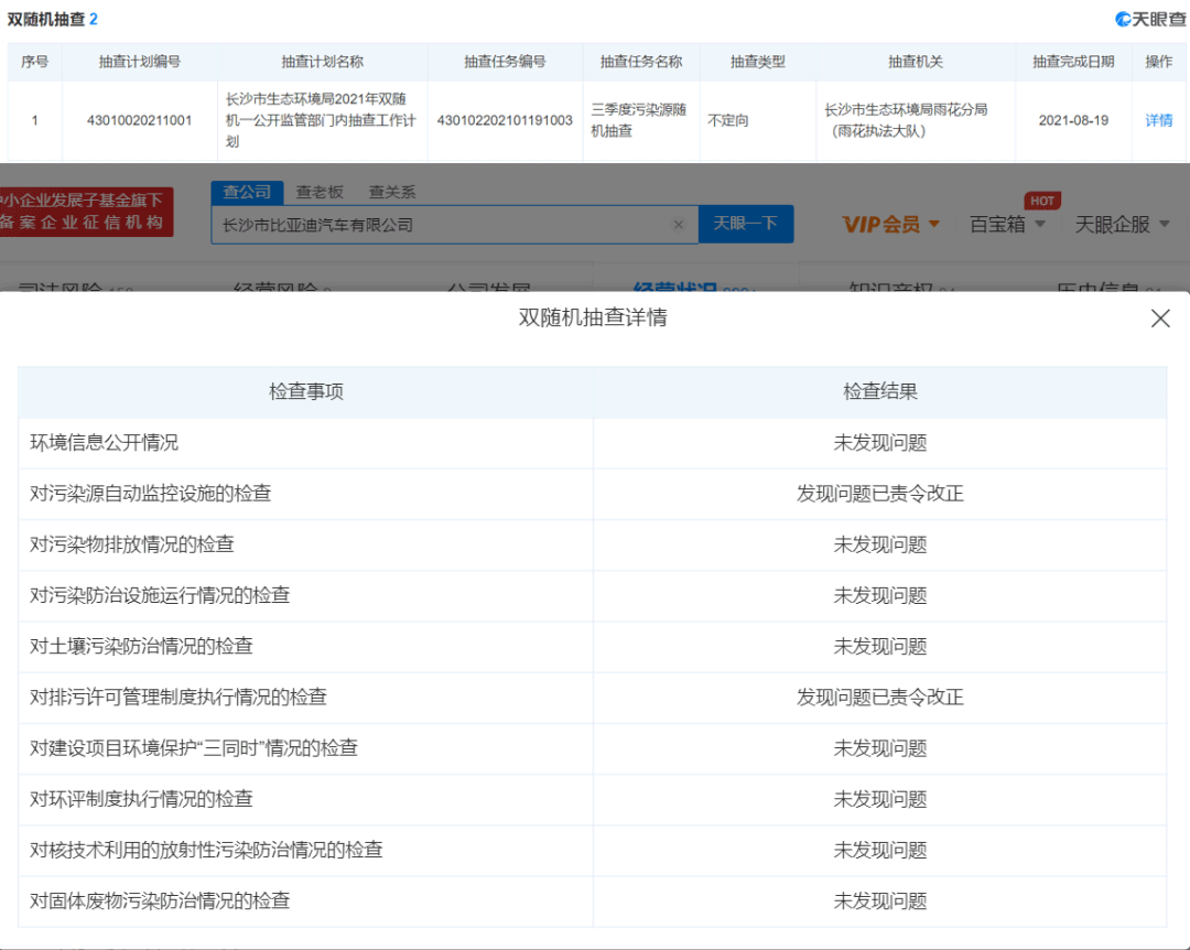 天眼查显示,长沙市生态环境局2021年三季度污染源随机抽查中,对长沙比亚迪污染源自动监控设施的检查、排污许可管理制度执行情况检查,均发现问题并已责令改正。