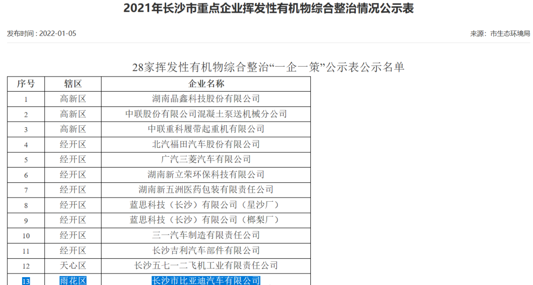 1月25日,长沙生态环境局官网发布2021年长沙市重点企业挥发性有机物综合整治情况公示,28家挥发性有机物综合整治“一企一策”公示表公示名单,包含了长沙比亚迪。