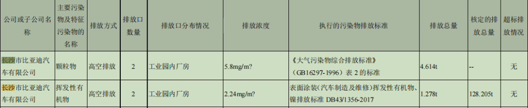 比亚迪在2021年年报中提及,长沙比亚迪的主要污染物排放等事项,不存在超标排放的情况。