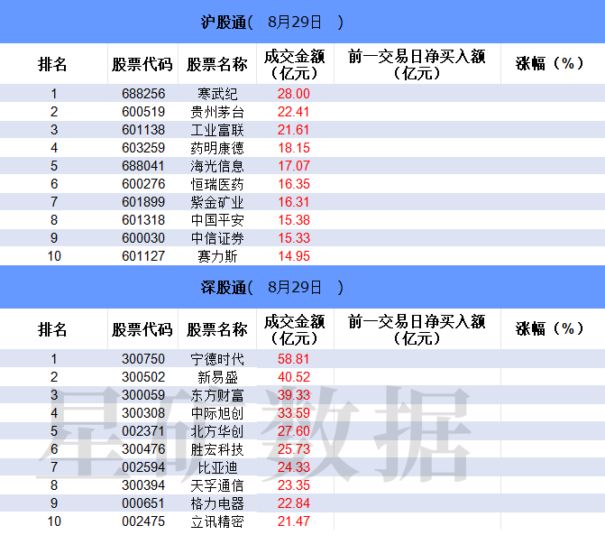 从沪股通前十大成交个股来看,寒武纪位居首位;贵州茅台和工业富联分居二、三位。