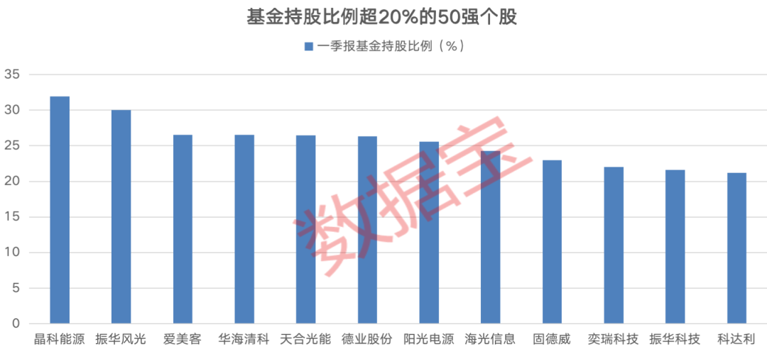 从机构持股方面来看,成长龙头50强多数获得公募基金重仓,近八成个股公募基金一季度末持股比例在10%以上,晶科能源和振华风光持股比例达到30%,其他还有爱美客、华海清科和天合光能持股比例居前。
