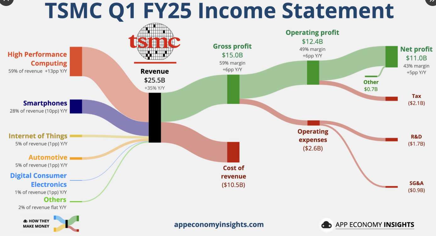 有着“芯片代工之王”称号的台积电(TSM.US)周四公布的业绩同样显示AI算力需求猛增,净利润猛增60%,更重要的是,在特朗普面向全球的关税大棒重压下,台积电重申强劲的业绩增长数据。台积电维持其2025年的营收增长预期,预计今年的增长速度仍将达到25%左右,与1月份设定的目标完全一致,其中人工智能(AI)相关的营收规模预计将翻番。