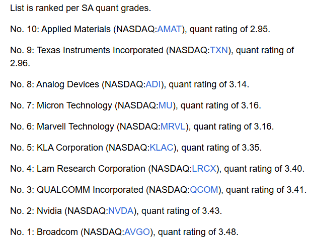 Alpha汇编的数据显示,这些股票市值至少达到100亿美元,并根据其专有量化系统进行排名。随着投资者们近期对半导体行业的关注度不断提升,该榜单提供了量化数据驱动的视角,帮助投资者了解哪些公司在日益严峻的宏观经济和地缘政治挑战中可能占据最佳位置。