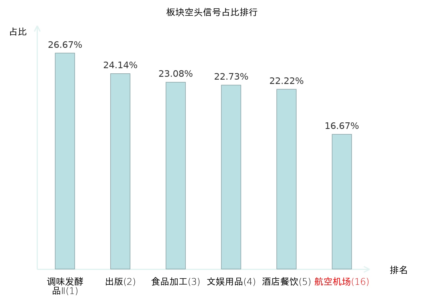 全市场所有行业板块中主力空头信号占比排名中,调味发酵品Ⅱ板块位居第一。中药Ⅱ板块名次提升最快,较昨日上升110位。