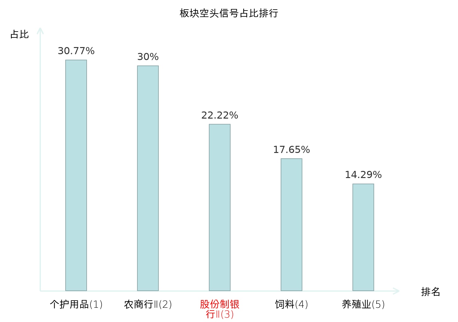 全市场所有行业板块中主力空头信号占比排名中,个护用品板块位居第一。个护用品板块名次提升最快,较昨日上升103位。