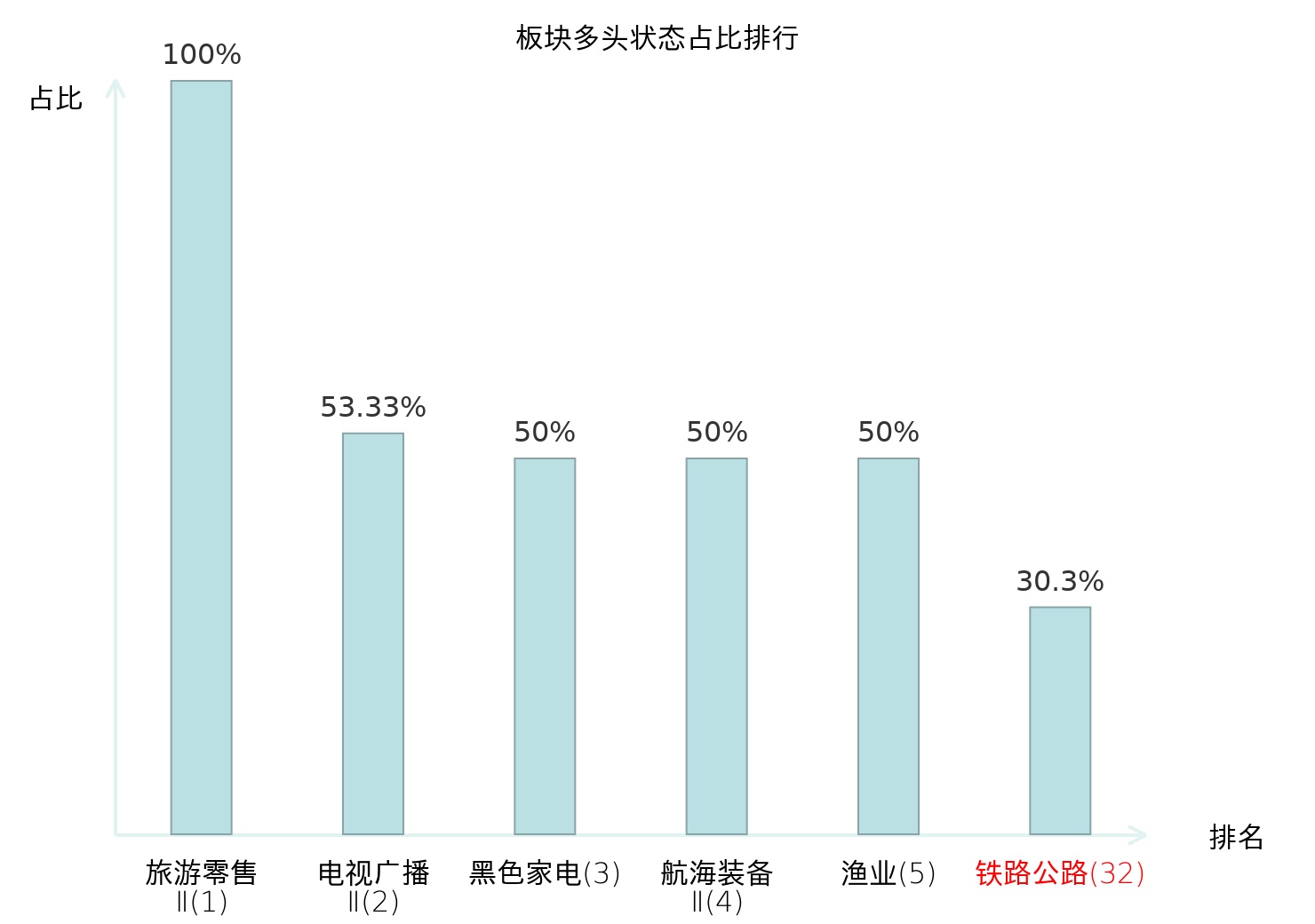全市场所有行业板块中主力多头状态占比排名中,旅游零售Ⅱ板块位居第一。教育板块名次提升最快,较昨日上升98位。