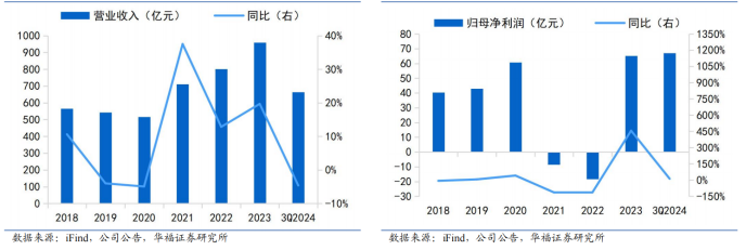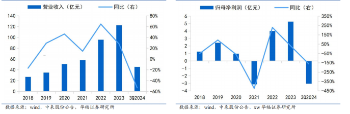 图表8:2018-3Q2024中来股份营业收入(左)2018-3Q2024中来股份归母净利润(右)