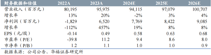 受益于新增装机投产以及煤价高位回落,公司未来业绩增长可期。华福证券预测24-26年公司营收分别为941.15、970.79和1007.07亿元,归母净利润分别为77.69、84.22和90.85亿元,对应PE分别为9.4/8.6/8.0倍。首次覆盖,给予“持有”评级。