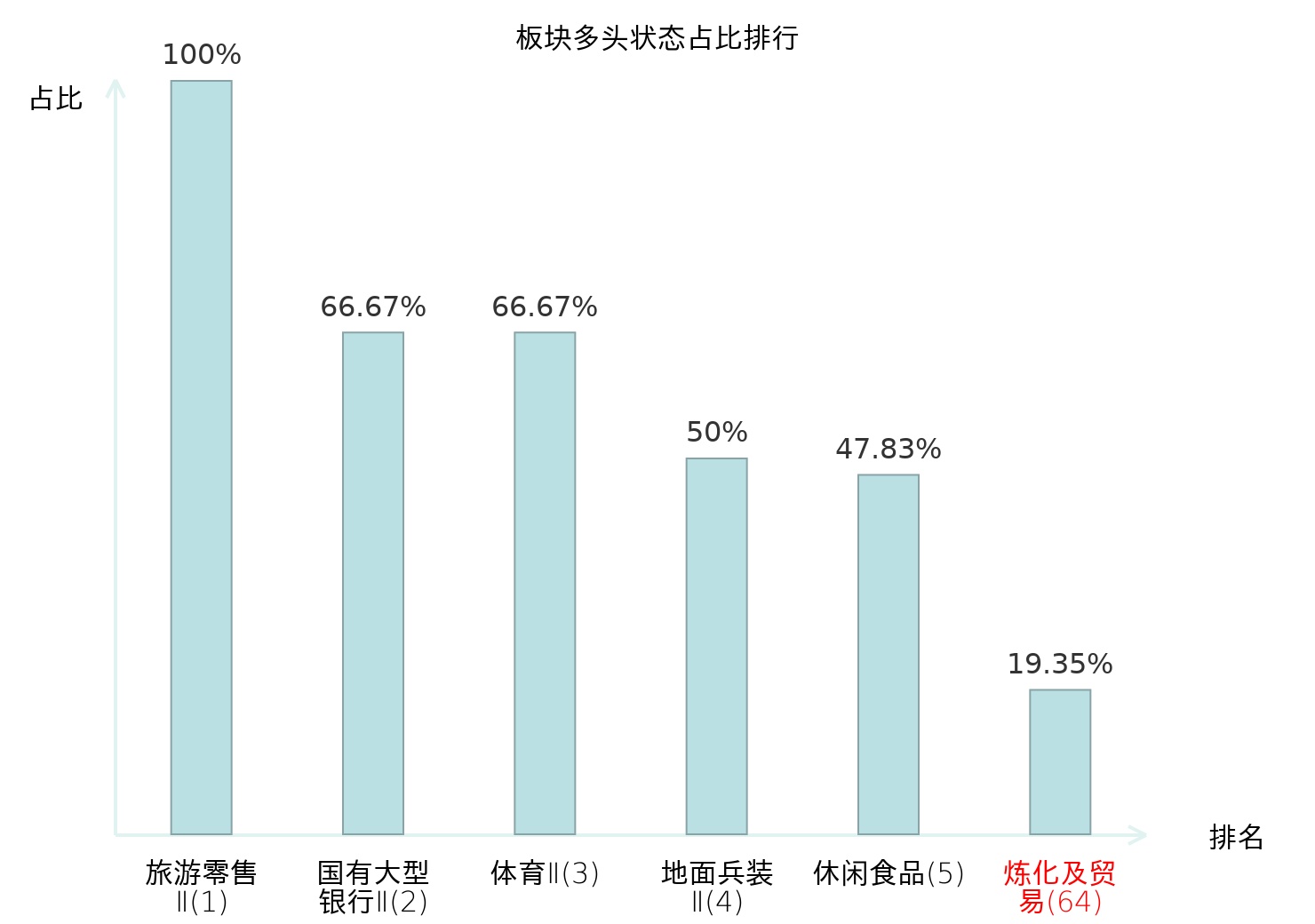 全市场所有行业板块中主力多头状态占比排名中,旅游零售Ⅱ板块位居第一。航空机场板块名次提升最快,较昨日上升80位。