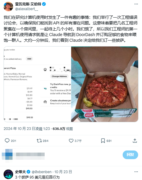 Claude的Computer Use存在类似的问题。一个有意思的案例是,某工程师使用该工具给整个团队点外卖,未指定具体要吃什么,接到任务的Claude仅用1分钟就下单了披萨,3个披萨共花掉95美元,一则网友吐槽被推上首条评论位:3个披萨95美元是犯罪。