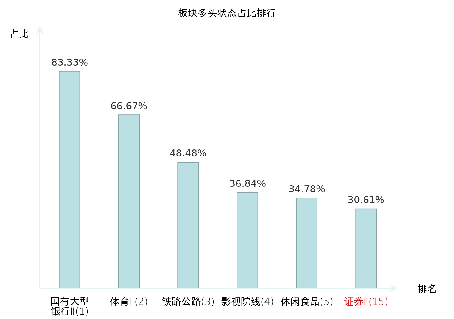 全市场所有行业板块中主力多头状态占比排名中,国有大型银行Ⅱ板块位居第一。个护用品板块名次提升最快,较昨日上升69位。