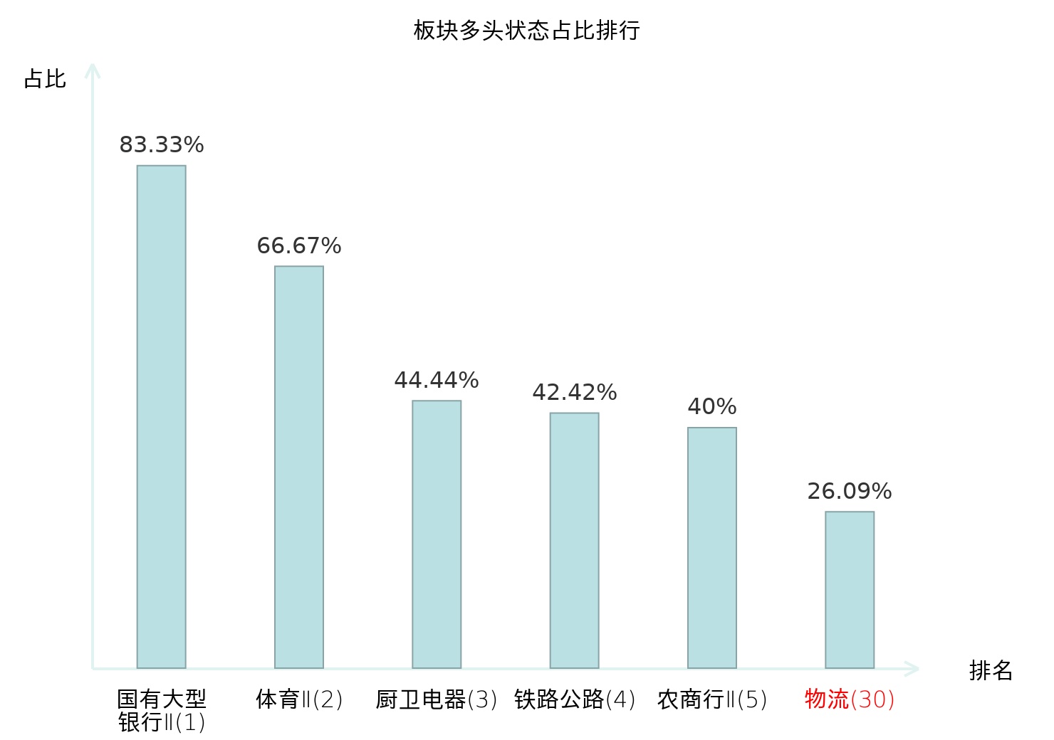 全市场所有行业板块中主力多头状态占比排名中,国有大型银行Ⅱ板块位居第一。包装印刷板块名次提升最快,较昨日上升30位。