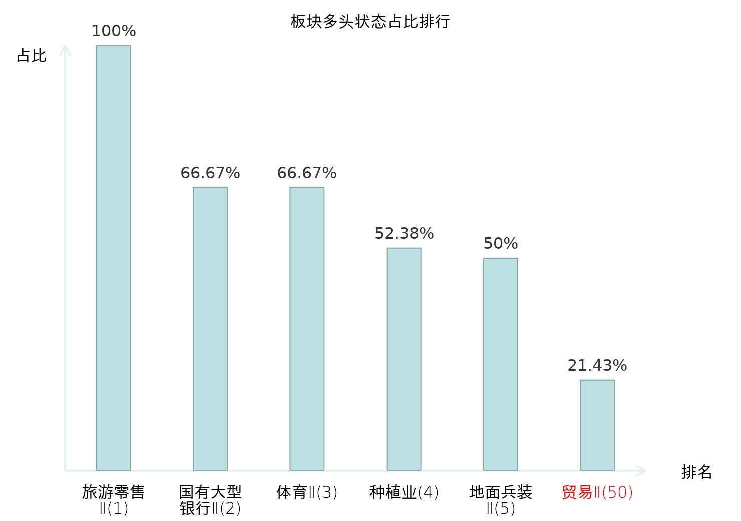 全市场所有行业板块中主力多头状态占比排名中,旅游零售Ⅱ板块位居第一。股份制银行Ⅱ板块名次提升最快,较昨日上升54位。