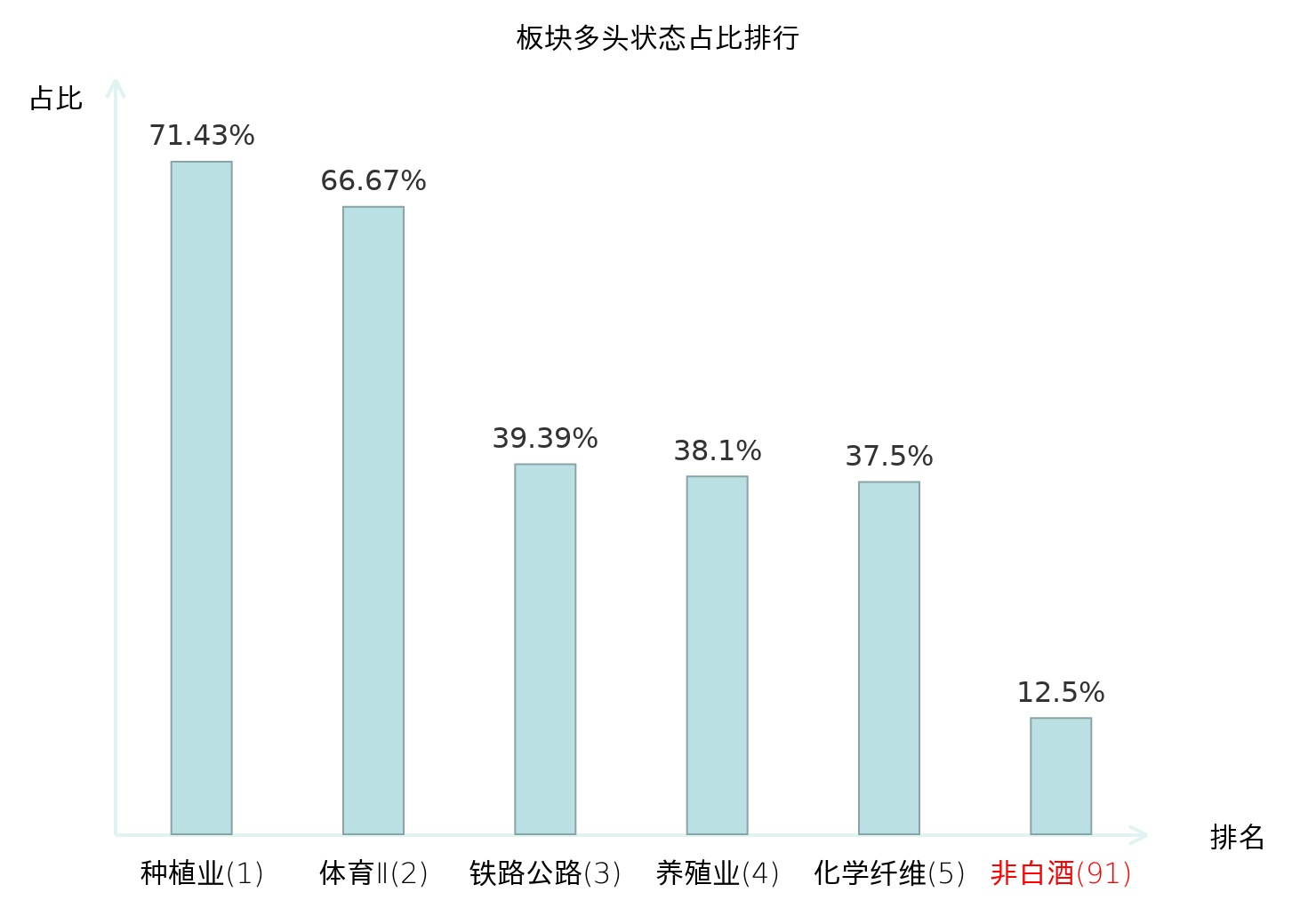全市场所有行业板块中主力多头状态占比排名中,种植业板块位居第一。养殖业板块名次提升最快,较昨日上升99位。