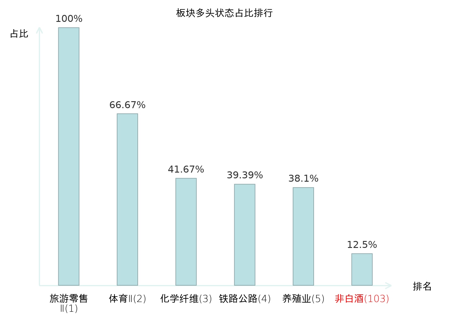 全市场所有行业板块中主力多头状态占比排名中,旅游零售Ⅱ板块位居第一。旅游零售Ⅱ板块名次提升最快,较昨日上升130位。