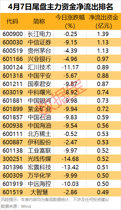 3股尾盘主力资金净流出金额超1亿元,长江电力尾盘主力资金净流出1.39亿元,居首。还有中信证券、贵州茅台、兴业银行、汇川技术等尾盘主力资金净流出金额居前。