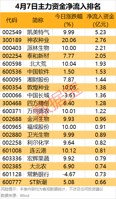 盘面上,农业股逆势上涨,神农种业“20cm”涨停,还有敦煌种业、北大荒、万向德农等多股涨停。北大荒、敦煌种业、万向德农主力资金净流入均超1亿元。