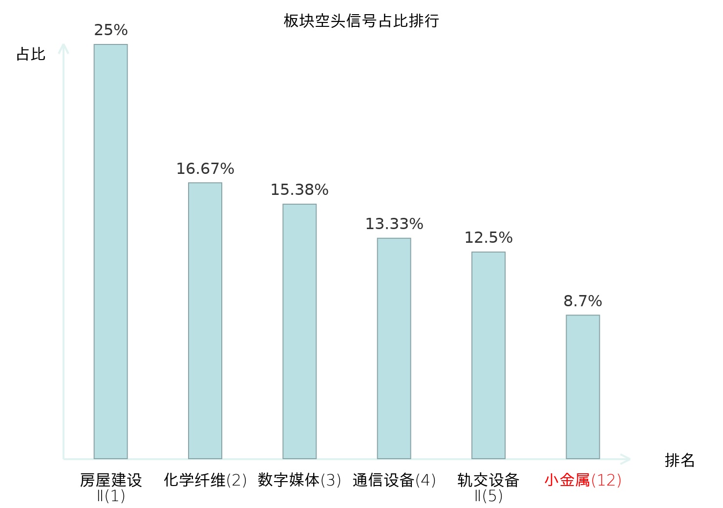 全市场所有行业板块中主力空头信号占比排名中,房屋建设Ⅱ板块位居第一。元件板块名次提升最快,较昨日上升112位。