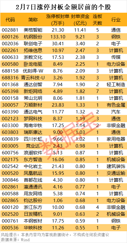 以封单金额计算,17股封单超1亿元,其中美格智能封单金额11.41亿元,杭钢股份、联创电子封单金额分别为9.21亿元、3.4亿元,紧随其后。