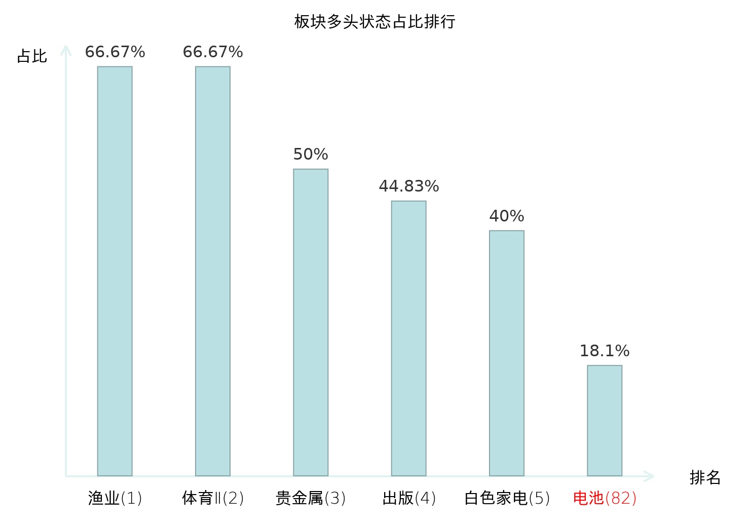 全市场所有行业板块中主力多头状态占比排名中,渔业板块位居第一。出版板块名次提升最快,较昨日上升95位。