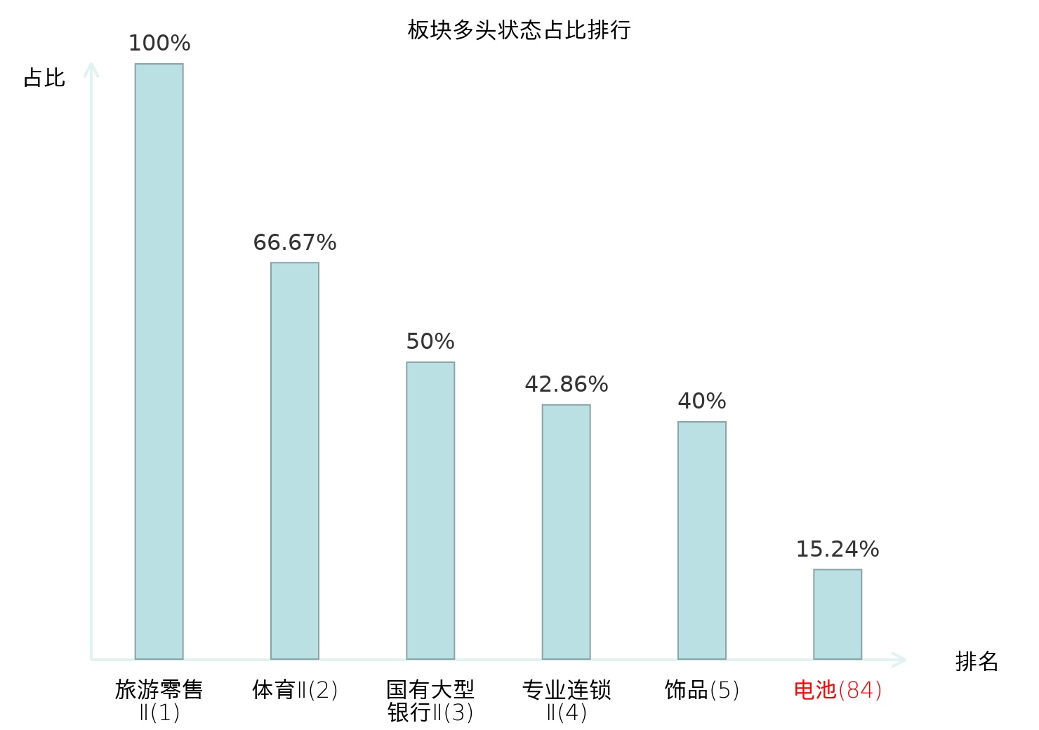 全市场所有行业板块中主力多头状态占比排名中,旅游零售Ⅱ板块位居第一。半导体板块名次提升最快,较昨日上升78位。