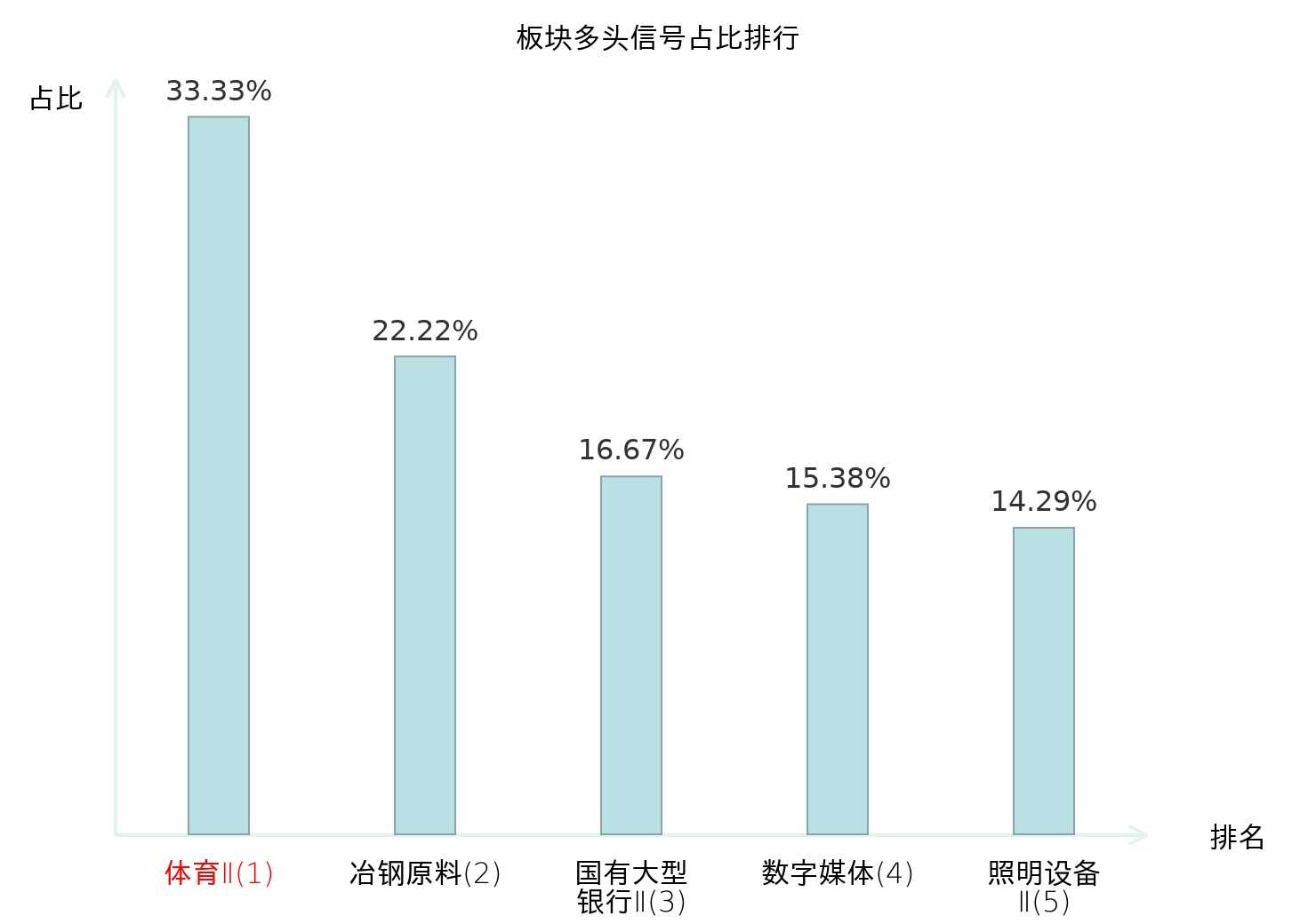 全市场所有行业板块中主力多头信号占比排名中,体育Ⅱ板块位居第一。体育Ⅱ板块名次提升最快,较昨日上升129位。