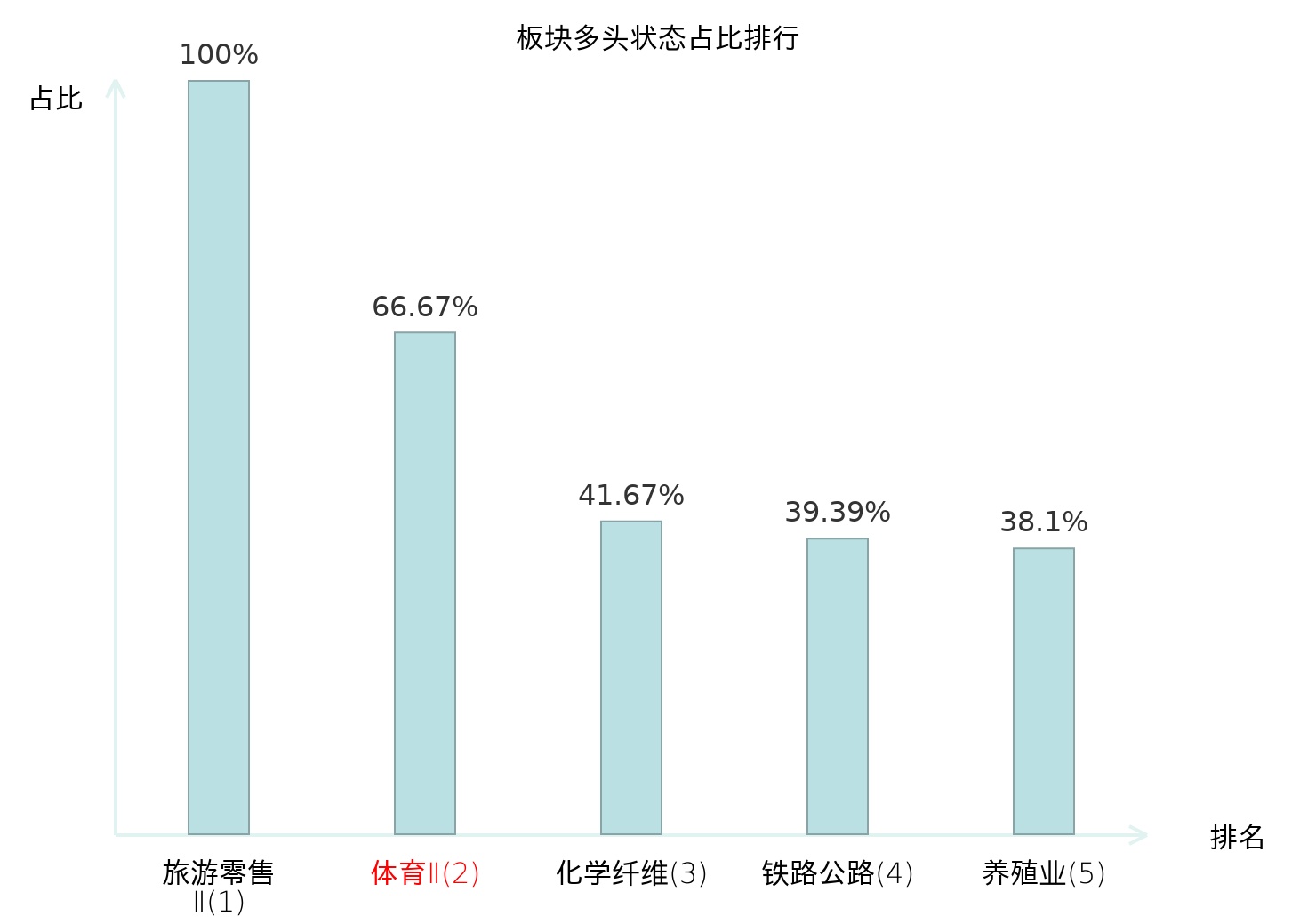 全市场所有行业板块中主力多头状态占比排名中,旅游零售Ⅱ板块位居第一。旅游零售Ⅱ板块名次提升最快,较昨日上升130位。