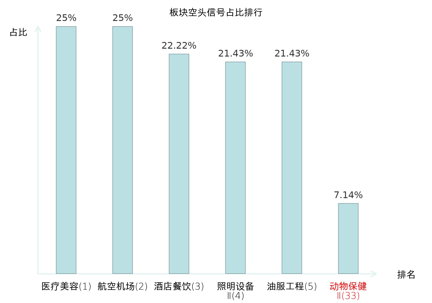 全市场所有行业板块中主力空头信号占比排名中,医疗美容板块位居第一。专业工程板块名次提升最快,较昨日上升108位。
