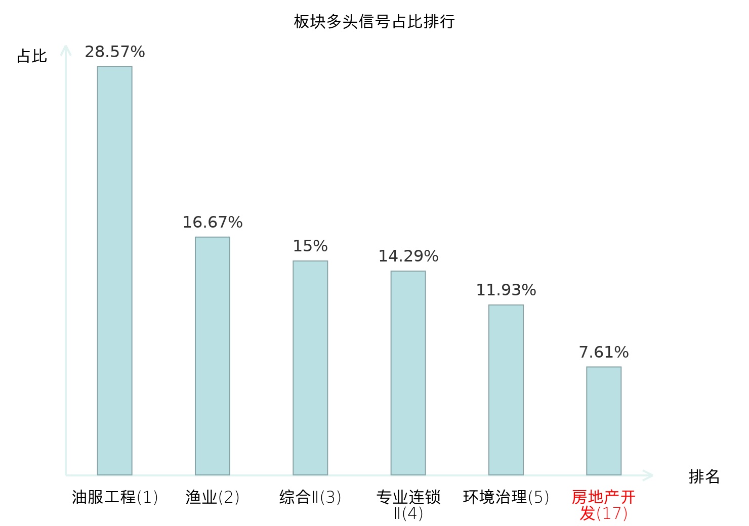 全市场所有行业板块中主力多头信号占比排名中,油服工程板块位居第一。房地产服务板块名次提升最快,较昨日上升110位。