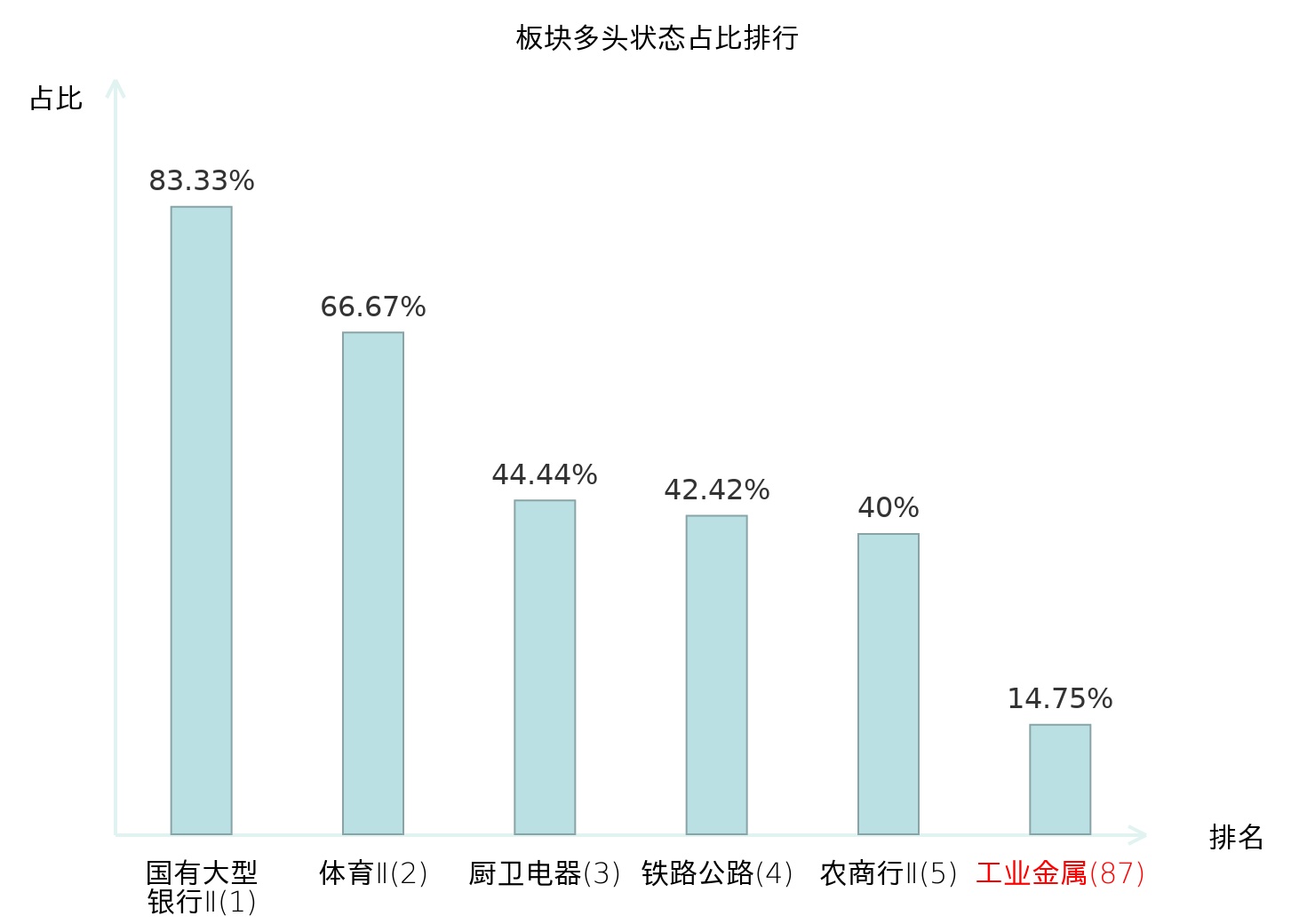 全市场所有行业板块中主力多头状态占比排名中,国有大型银行Ⅱ板块位居第一。包装印刷板块名次提升最快,较昨日上升30位。