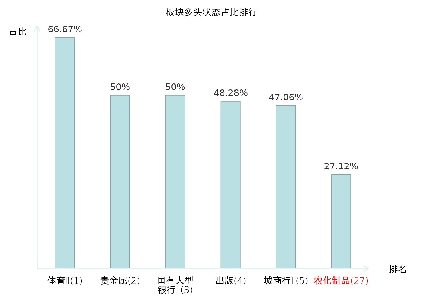 全市场所有行业板块中主力多头状态占比排名中,体育Ⅱ板块位居第一。电子化学品Ⅱ板块名次提升最快,较昨日上升78位。