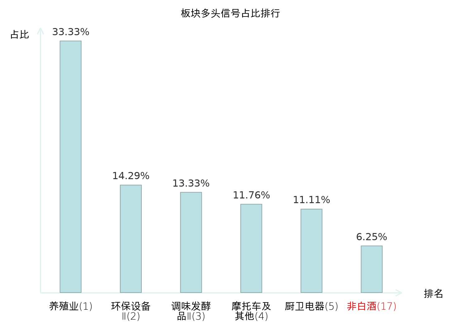 全市场所有行业板块中主力多头信号占比排名中,养殖业板块位居第一。厨卫电器板块名次提升最快,较昨日上升109位。