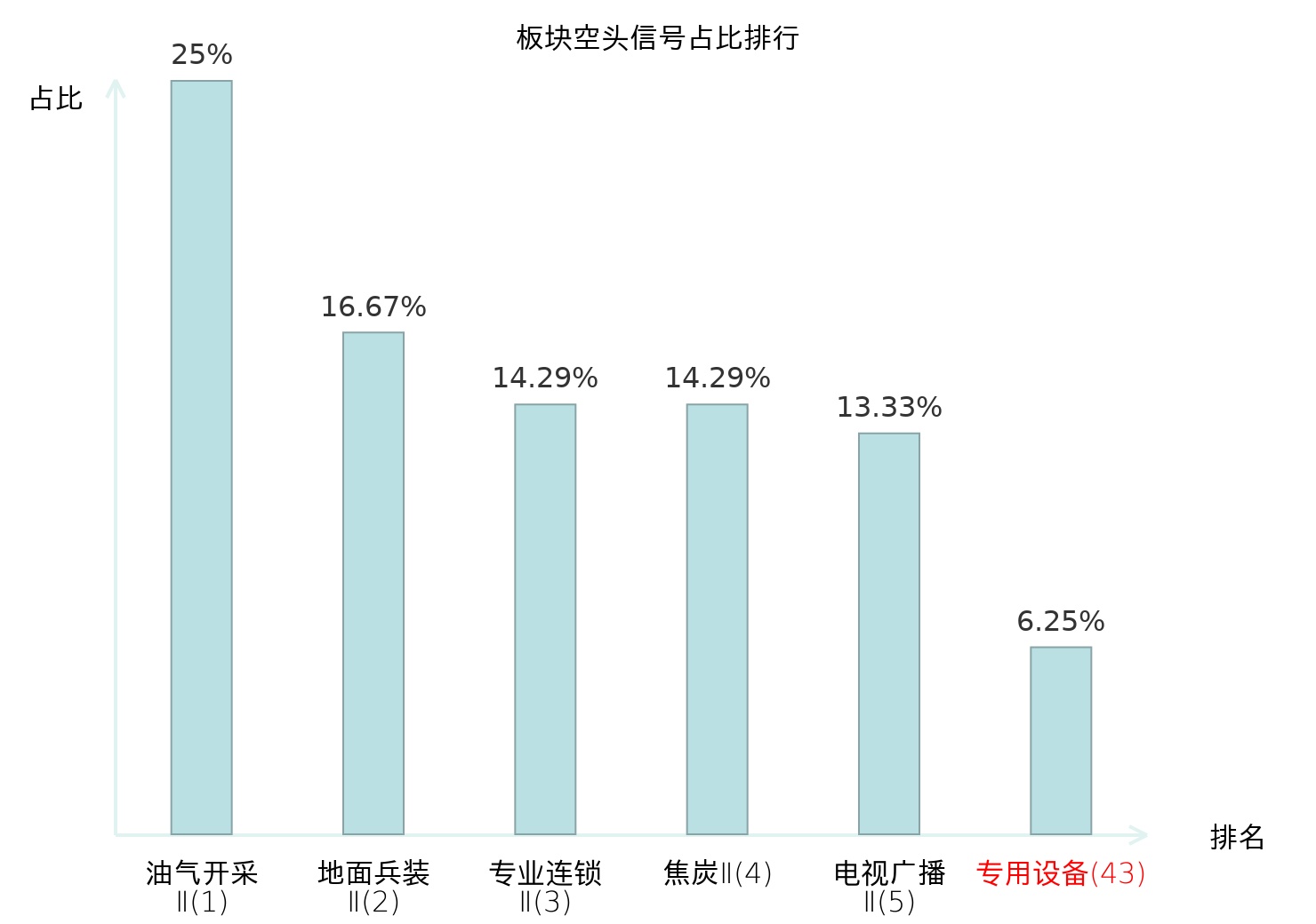 全市场所有行业板块中主力空头信号占比排名中,油气开采Ⅱ板块位居第一。化妆品板块名次提升最快,较昨日上升102位。