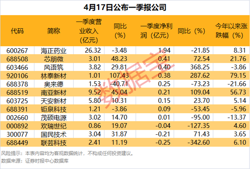 4月17日,共有12家公司公布一季报,从盈利规模看,海正药业一季度净利润居首,实现净利润1.94亿元;芯朋微风语筑净利润均超4000万元。