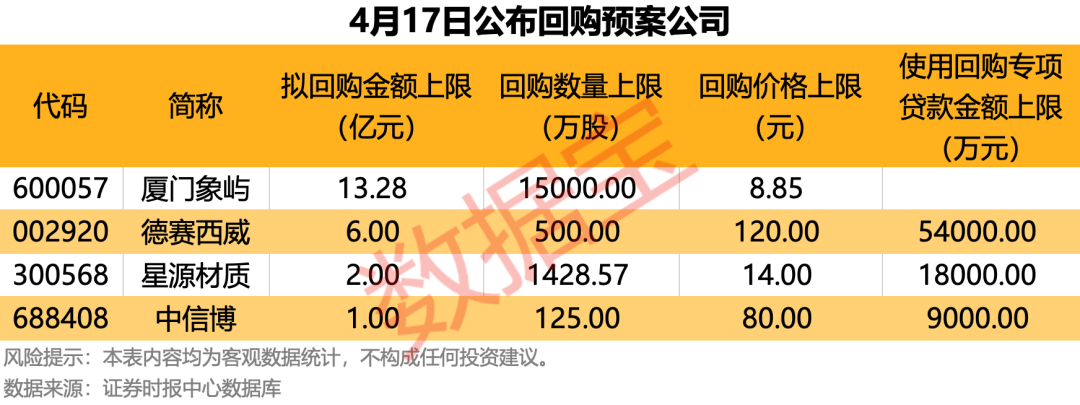 4月17日,厦门象屿德赛西威星源材质中信博4家公司披露股份回购方案,合计拟回购金额22.28亿元。