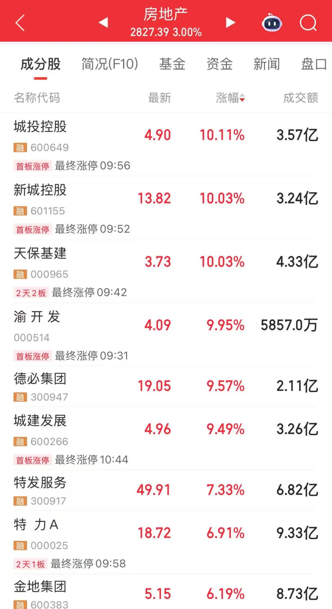 行业方面,房地产板块走强,特发服务城投控股荣丰控股等多股涨停;其中,荣丰控股天保基建等收获两连板。电子化学品、塑料制品、黑色家电等板块均涨超2%。
