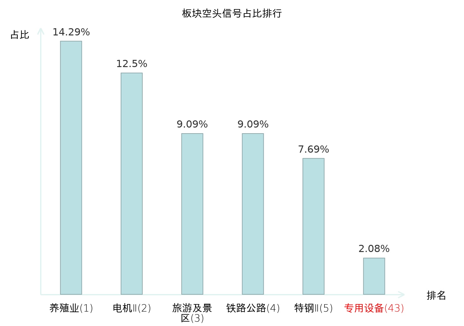 全市场所有行业板块中主力空头信号占比排名中,养殖业板块位居第一。电机Ⅱ板块名次提升最快,较昨日上升118位。